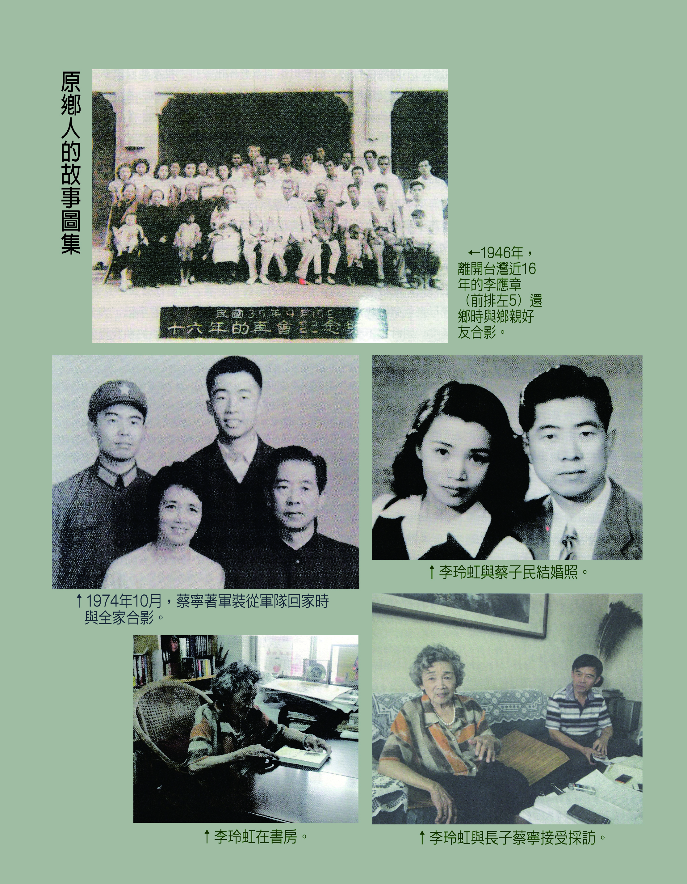 日據時期著名的彰化二林事件主要領導人李應章,1931年被迫離開台灣後,1946年短暫重回二林故里與鄉親見面,此後再也沒有回過台灣,本文是李應章的女兒李玲虹(玉惠)透過口述回憶她的父親。小時候每當玉惠問「爸爸去哪兒?」她的母親都會流著眼淚摟緊她說:「爸爸回不來。」李玲虹後來跟父親到了上海,嫁給彰化二林故里的鄰居蔡子民,育有兩子,長子蔡寧曾參加1979年懲越戰爭。本文摘自北京「台海出版社」出版的《番薯仔兩岸留痕》。編者