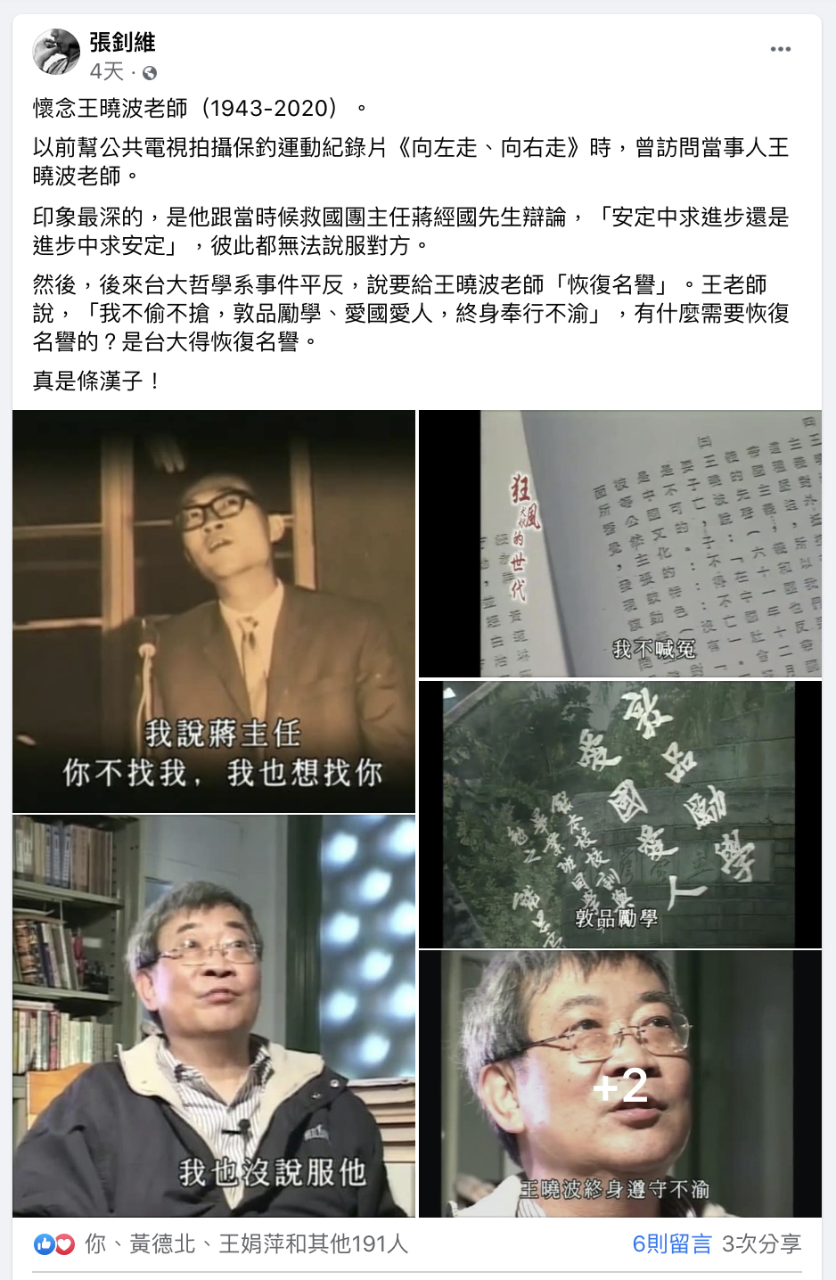 我雖非生於台灣,但長於台灣。我為保衛台灣宜蘭的釣魚台列嶼主權而參加發起學生保釣運動;我為台灣老兵發起和參加老兵返鄉探親運動;我為保衛台灣人民也擁有的大陸領土主權,參加和發起兩岸和平統一運動。我為認同台灣而發起成立「台灣史研究會」,並為賴和、王敏川、林少貓、李友邦、楊逵等台灣抗日先烈們的平反大聲疾呼,並推動平反「二二八事件」及參加「戒嚴時期不當叛亂及匪諜審判案件補償基金會」,為「白色恐怖」政治受難人平反寃抑。