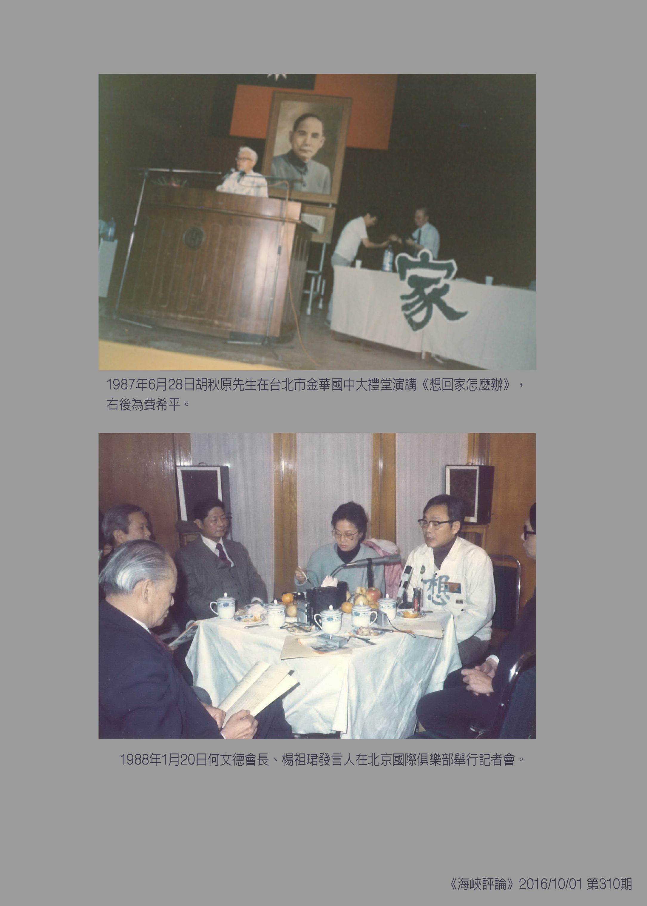↓1987年6月28日胡秋原先生在台北市金華國中大禮堂演講《想回家怎麼辦》,右後為費希平。