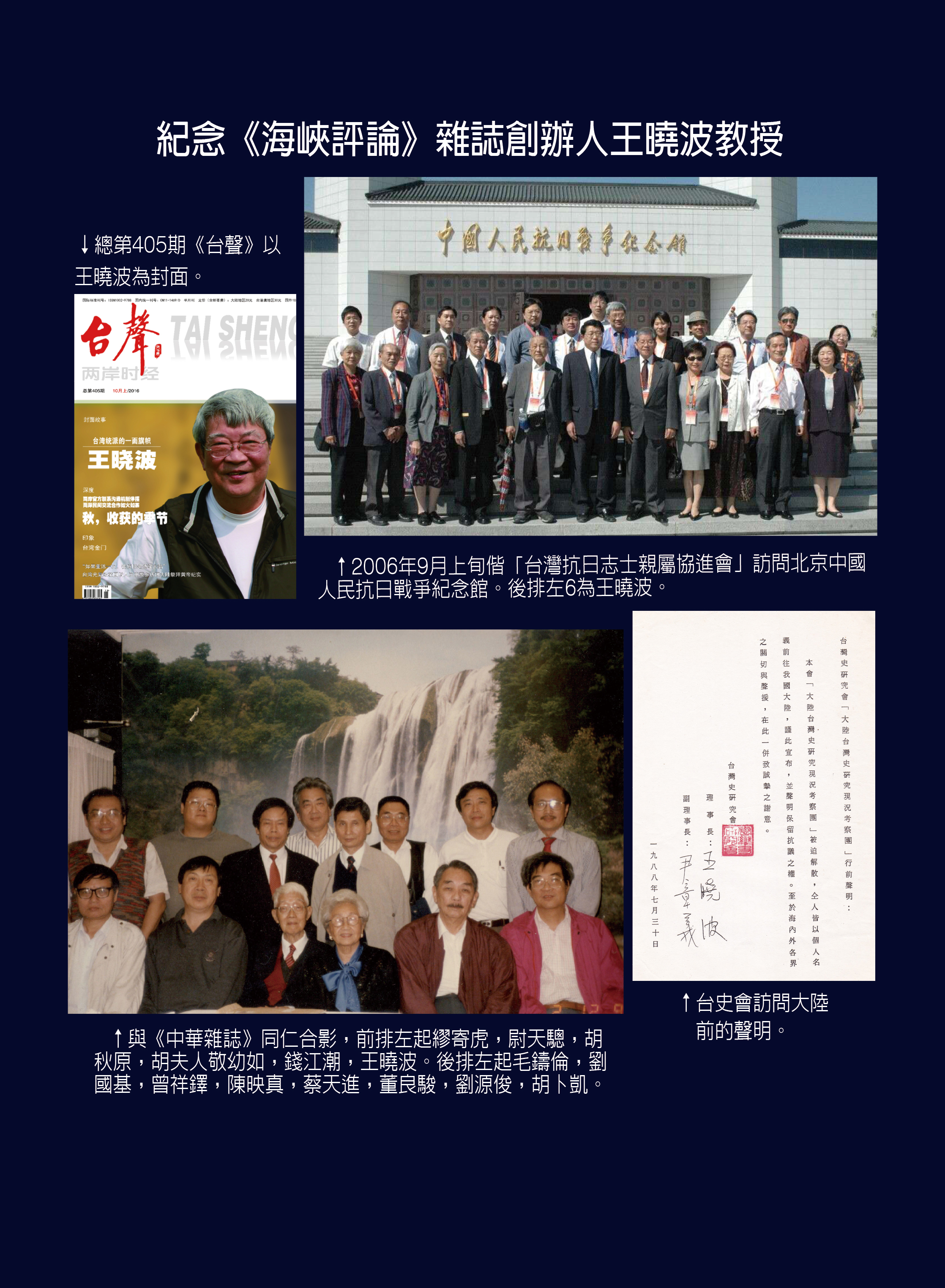 2020年7月30日,本誌創辦人王曉波教授去世;同月28日曾任本誌副總編輯多年的毛鑄倫先生去世;8月13日本誌編輯委員曾健民先生去世。不到一個月時間,創辦人與兩位曾為本誌付出過心血的愛國志士先後離去,我們致以沉痛的哀悼之餘,誓將以更堅定的步伐,繼續他們的志業,為國家的和平統一與民族的復興不懈奮鬥。